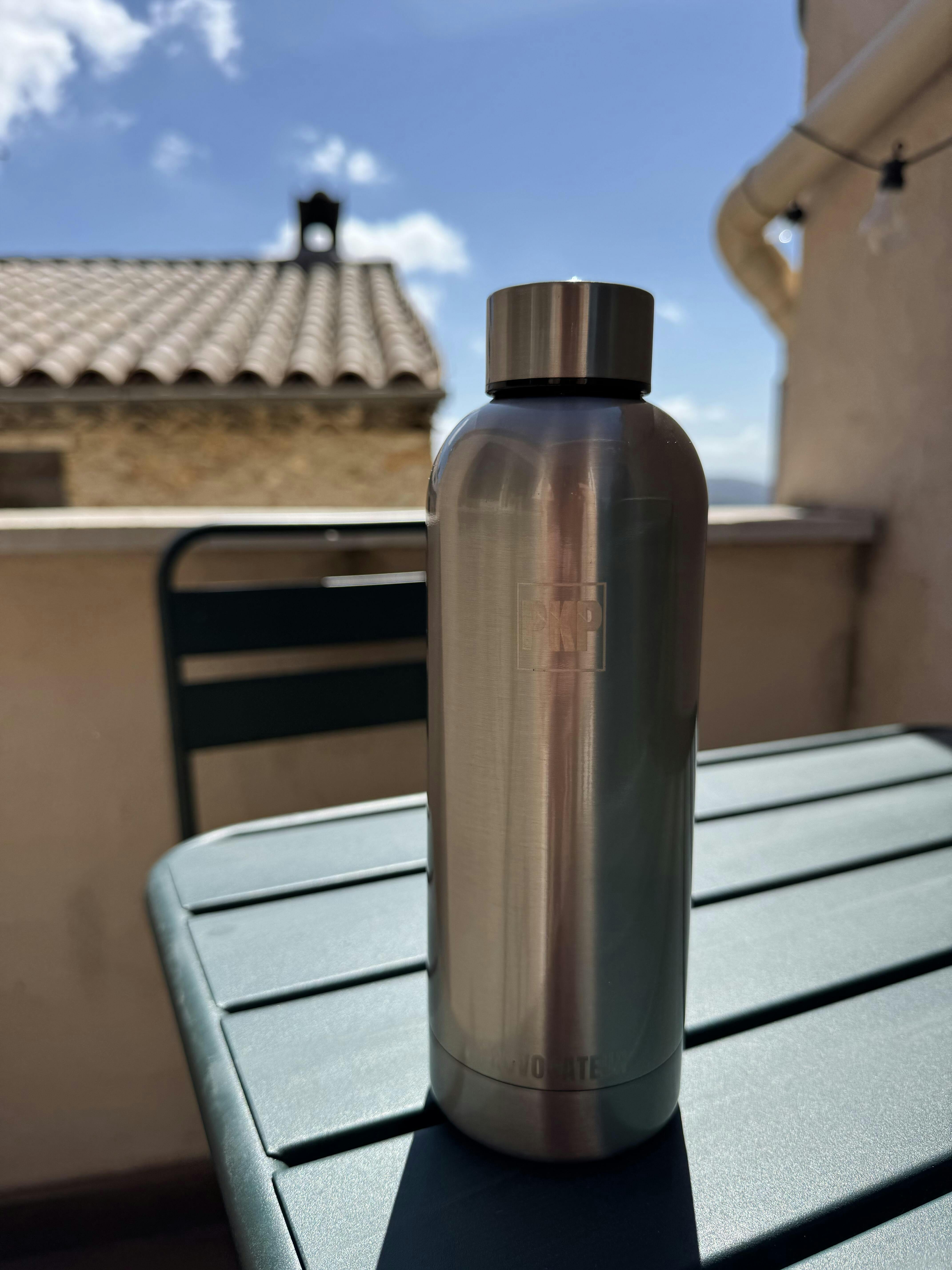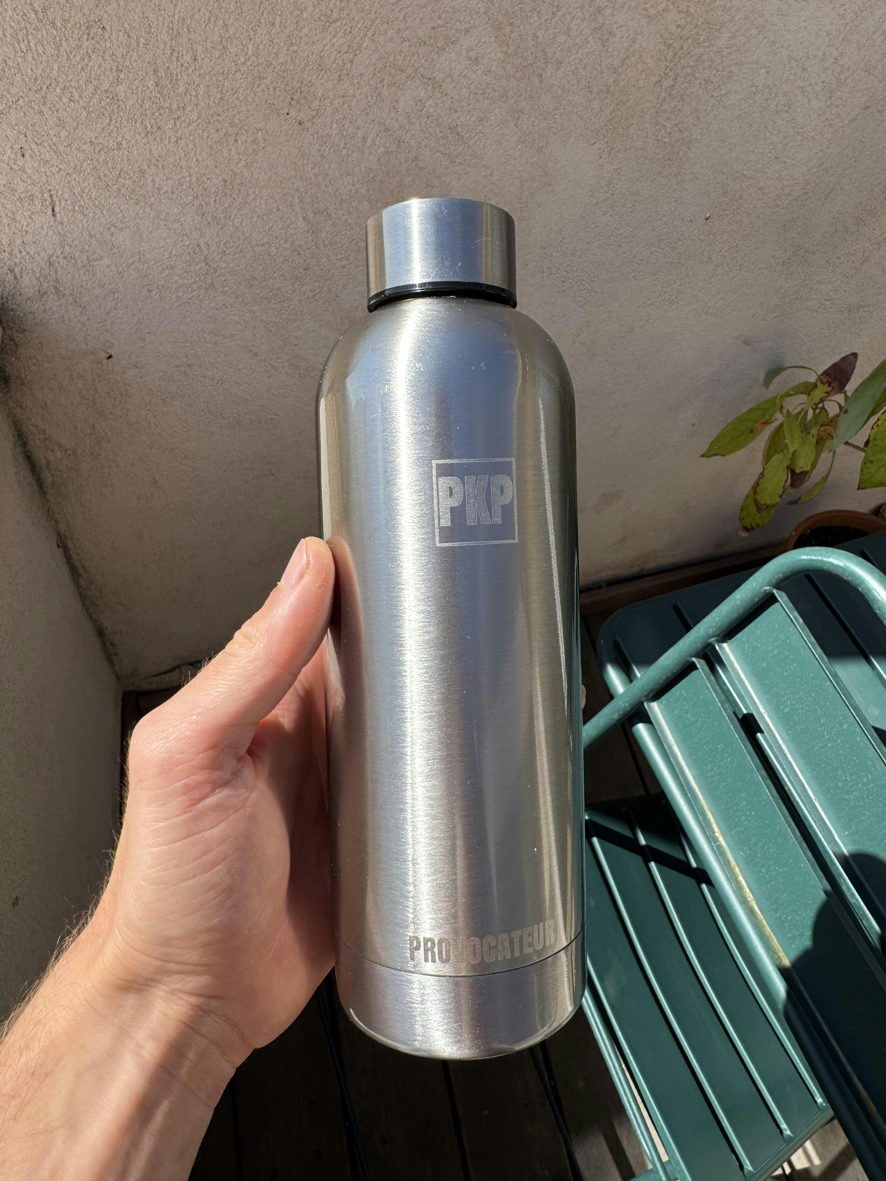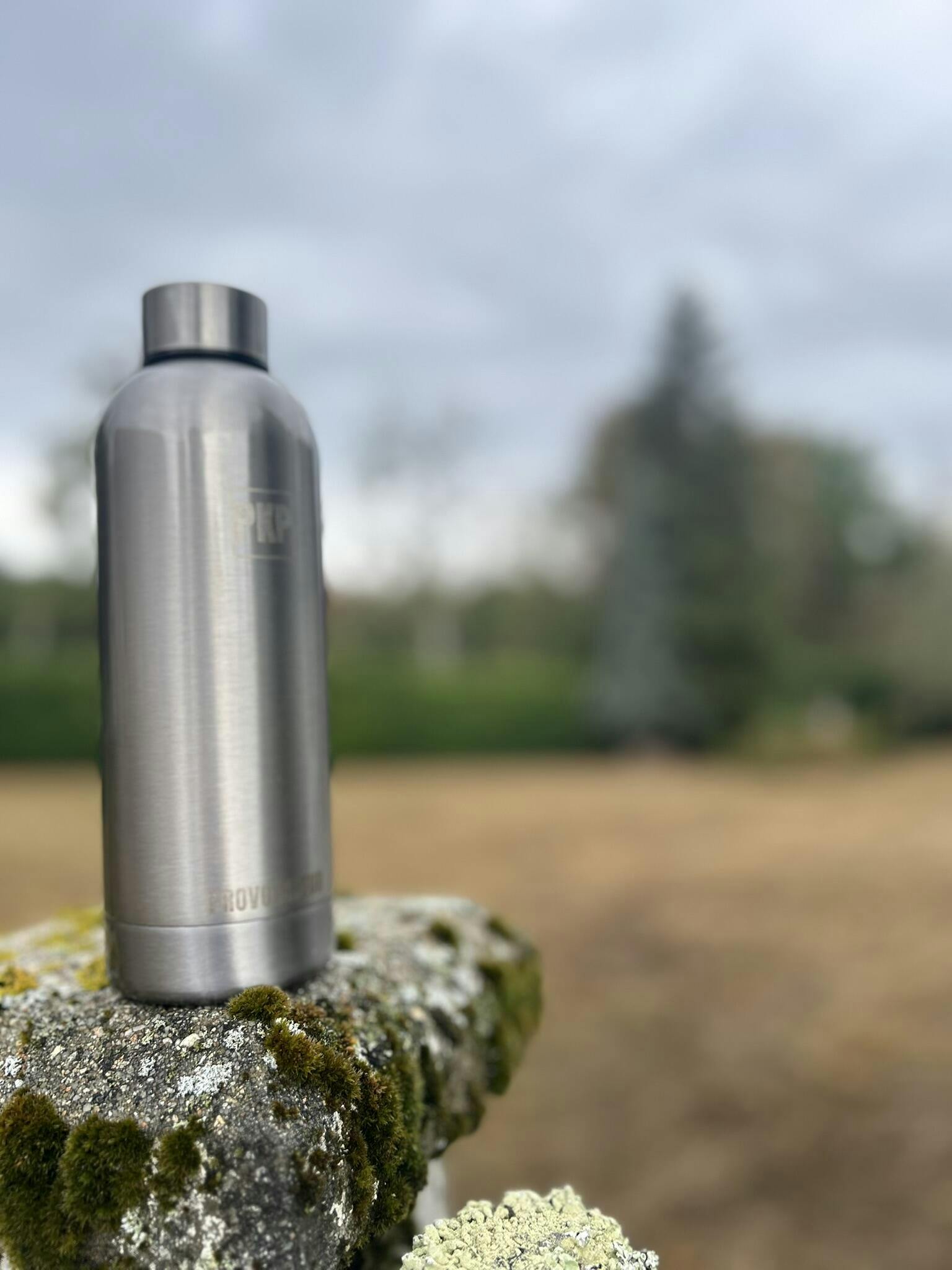 Corps en acier inoxydable, gravure laser indélébile, zéro peinture qui s'écaille. Ta gourde est conçue pour durer — pas pour être remplacée.